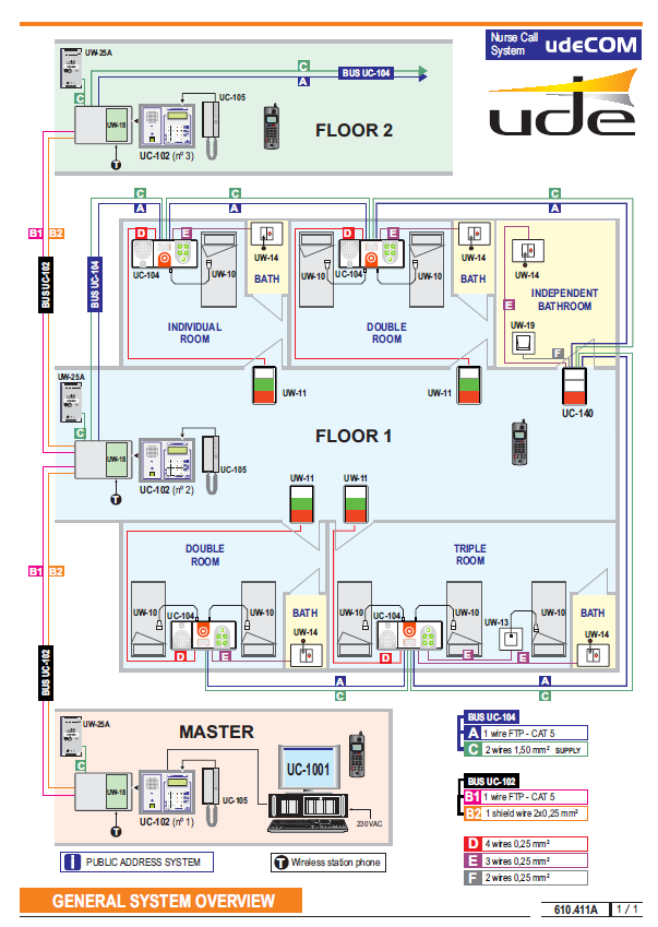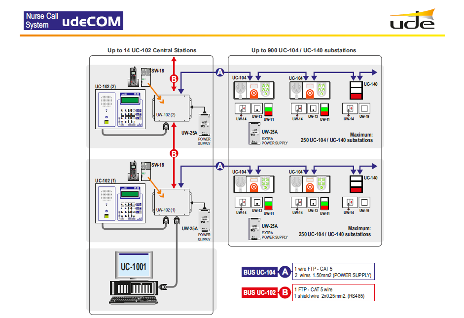 UDECOM is based in a digital micro controller technology. One or more central stations will have the active role of computing the data exchange of the room substation via FTPcat5 data and audio bus. Also different central stations can be connected with an audio and data bus, allowing a total communication of the whole system. This way of operating makes really simple and easy the installation and starting up.