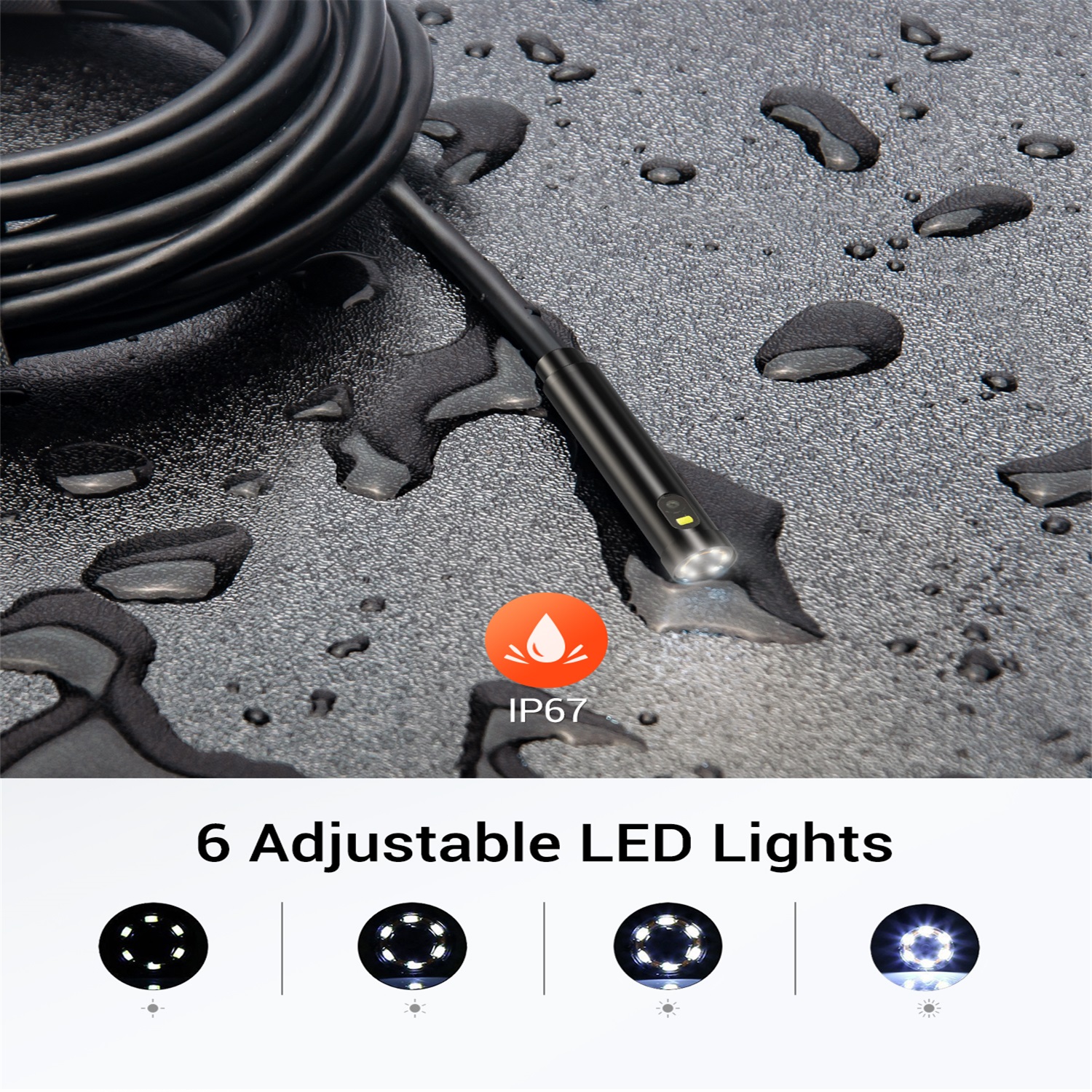 - Đèn pin & 7 đèn LED - Với 7 đèn LED và đèn pin sáng, nội soi ống kính kép chiếu ánh sáng vào bóng tối. Đèn LED có thể được điều chỉnh độ sáng để giữ cho hình ảnh được lấy nét và hiển thị.