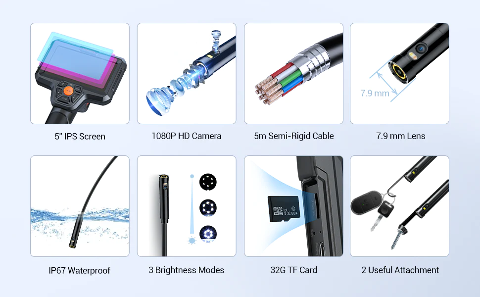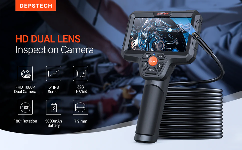 - Ống kính 7,9 mm, Màn hình IPS 5 "được cập nhật: Đầu dò camera cầm tay này chỉ có đường kính 7,9 mm, có thể thoải mái tiếp cận nhiều nơi hẹp. Phù hợp để kiểm tra đường ống, bảo dưỡng ô tô, kiểm tra khe hở, v.v. Sẵn sàng sử dụng sau khi bật nguồn, hiển thị hình ảnh thời gian thực trực tiếp trên màn hình 5"
