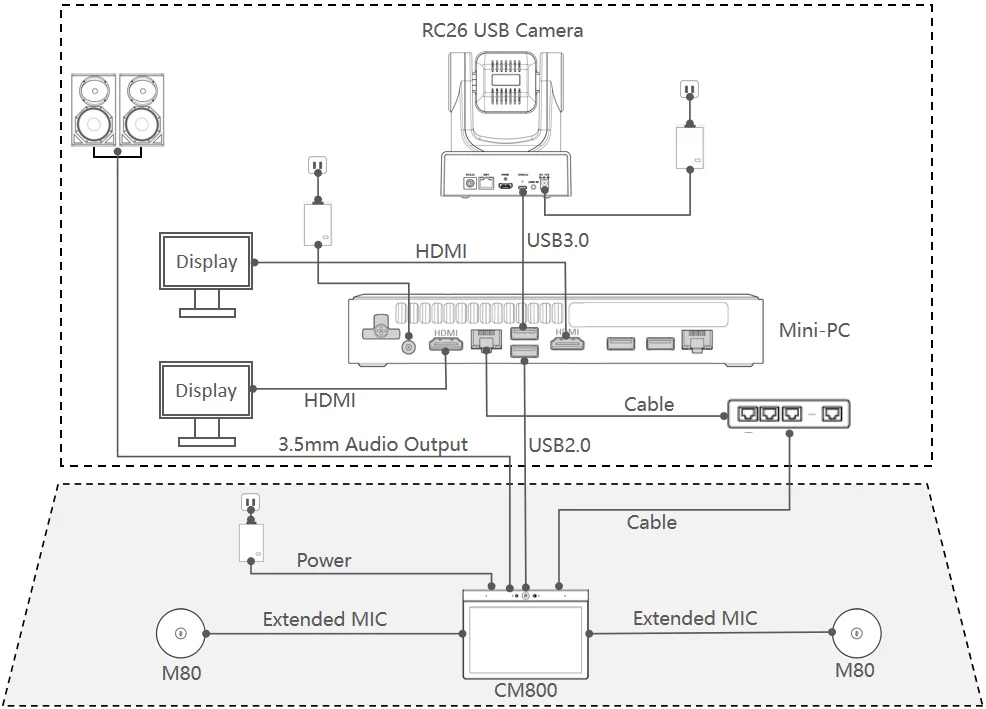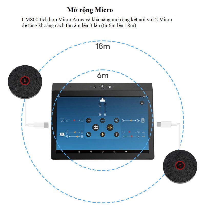 Tích hợp độ nhạy cao, micro mảng, tỷ lệ tín hiệu trên tiếng ồn cao và loa có độ trung thực cao với chức năng khử tiếng ồn tự động hiệu suất cao, kiểm soát độ lợi tự động, thuật toán loại bỏ tiếng vọng tự động, khoảng cách thu âm lên đến 6 mét, công suất loa lên đến 10W. Có thể kết nối tối đa 2 micro mở rộng để mở rộng phạm vi thu lên gấp 2 lần. Micro chính và micro mở rộng có thể được chuyển đổi một cách thông minh để làm cho âm thanh thu được rõ ràng và tự nhiên hơn. CM800 có thể được kết nối với âm thanh bên ngoài thông qua cổng âm thanh 3,5 mm, cải thiện đáng kể trải nghiệm âm thanh của các phòng hội nghị quy mô vừa và lớn.