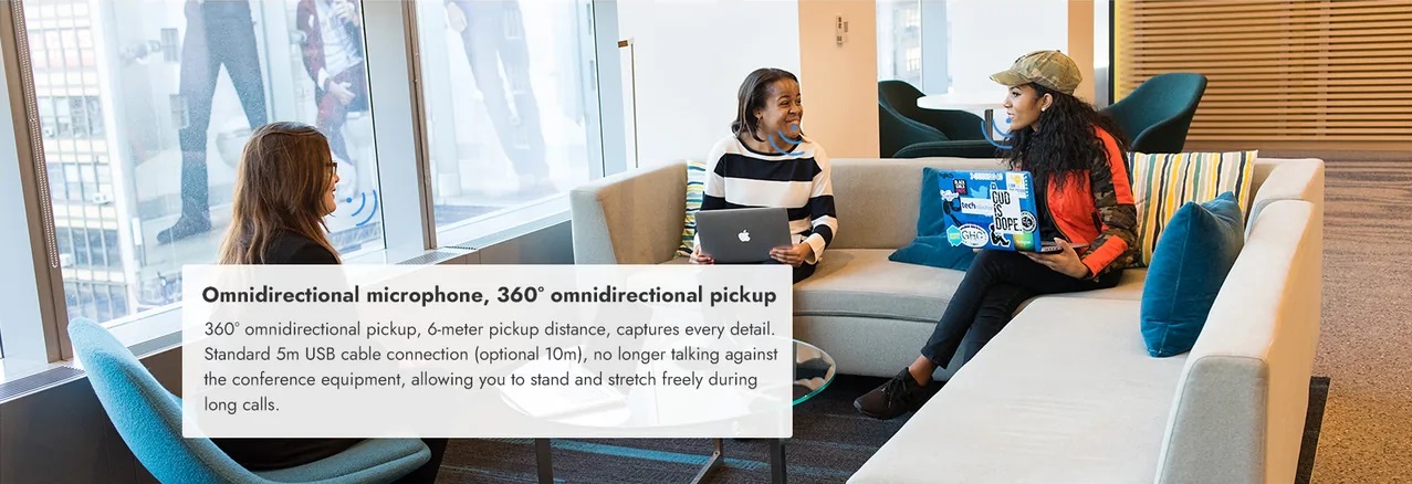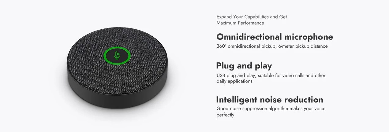 The compact and portable USB omnidirectional microphone has a small and unique shape, 360-degree omnidirectional pickup, 6-meter pickup distance, 5-meter USB cable, no longer talking against conference equipment, allowing you to stand and stretch freely during long calls.